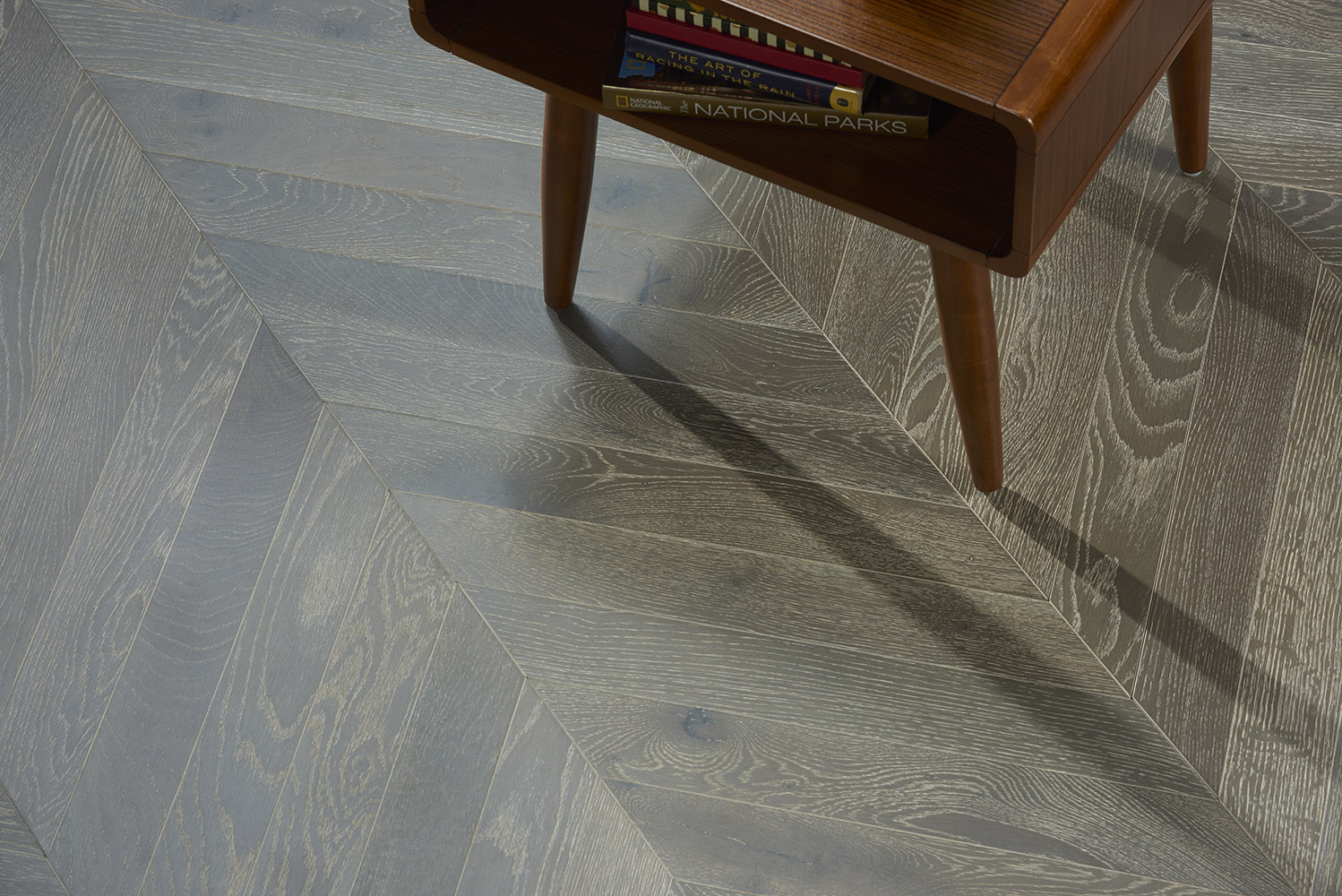 Canterbury Chevron is Oak, Mill Run, Reactive Stain, Brushed, Grey Toned, Natural Oiled, Tongue and Groove.